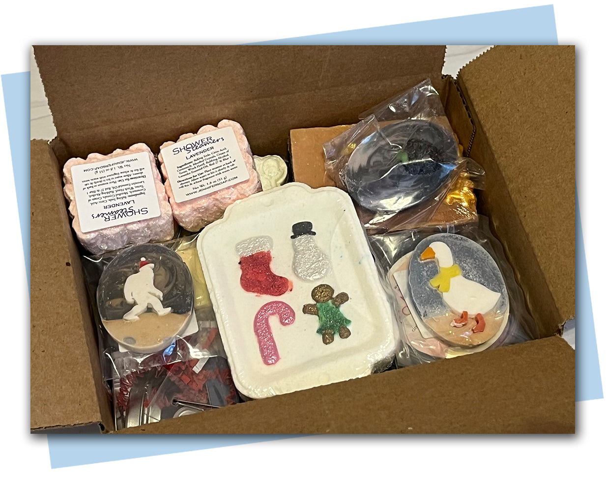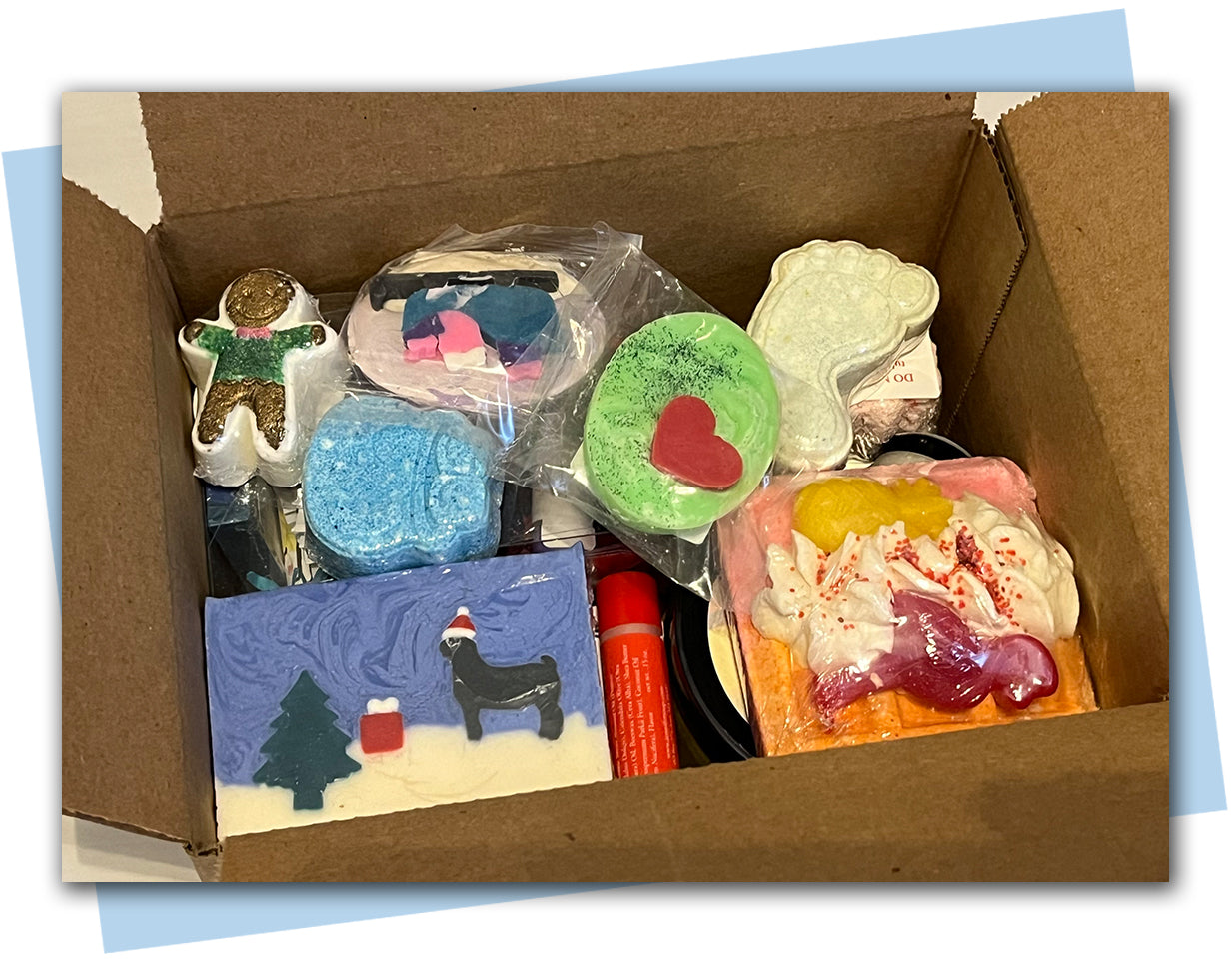 This box is a collection of full size bars of soaps, and bath products like hand & foot balms, lip balms, lip scrubs, and sugar scrubs, shower steamers, foot fizzies, and bath bombs! And some mini holiday gift sets!
