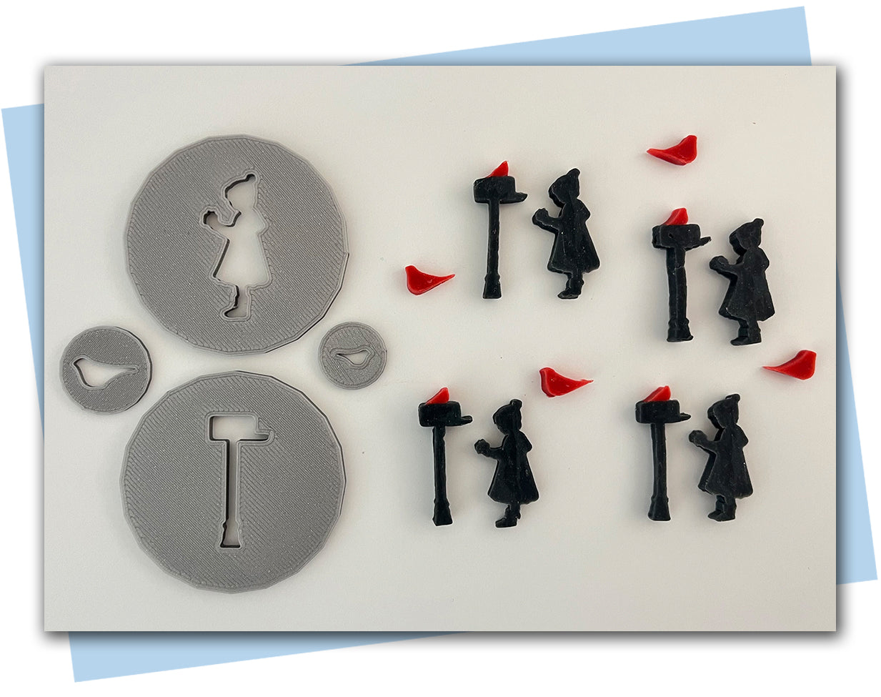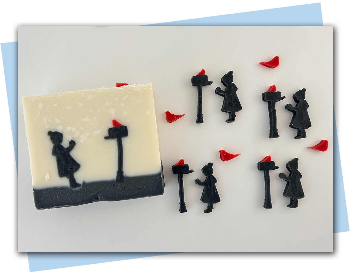 This new silhouette inspired disc set of a girl holding a present that she's putting in the mailbox, with a winter bird sitting on top comes with (2) 57mm disc and either an 18mm or 23mm disc.
